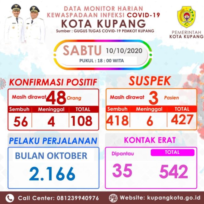 “Konfirmasi Positif Covid-19 sebanyak 108 Orang (Naik sebanyak 4 Orang); Masih di rawat sebanyak 48 Orang (Naik sebanyak 4 Orang); Sembuh sebanyak 56 Orang; Meninggal sebanyak 4 Orang”, Kata Jubir Gugas Percepatan Penganan Corona Virus 2019 (covid-19) Kota Kupang Ernest Ludji, S.STP, M.Si kepada Media di Kupang Sabtu (10/10).