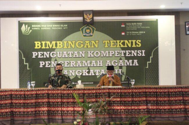 KUPANG, FLOBAMORA-SPOT.COM – Kasdim 1604/Kupang Letkol Inf Sugeng Prihatin, S.Sos., M.Sc., M.Tr., Hanla, menghadiri Bimbingan Teknis Penguatan Kompetensi Penceramah Agama Angkatan II Dandim 1604/Kupang Letkol Inf Jimmy Rihi Tugu.