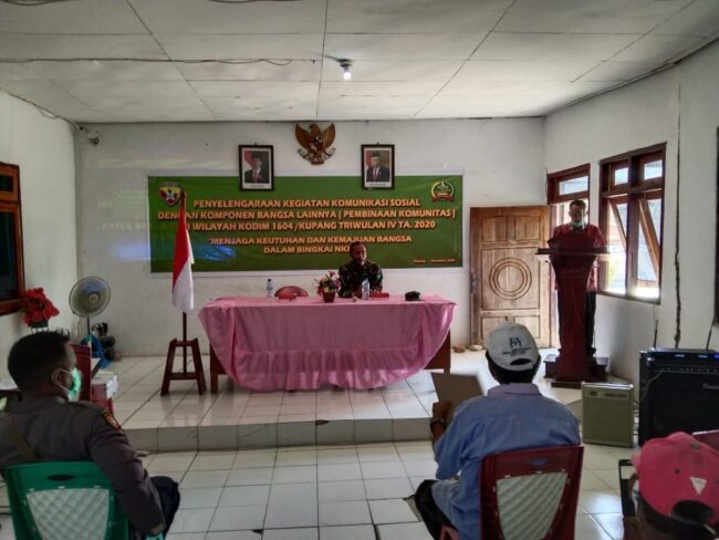 OELAMASI, FLOBAMORA-SPOT.COM – Guna membangkitkan semangat persatuan, kesatuan dan menumbuhkan kebanggaan terhadap NKRI, Kodim 1604/Kupang menjalin hubungan yang baik dan harmonis dengan menggelar Komunikasi Sosial (Komsos) TNI bersama Komponen Bangsa Lainnya (Pembinaan Komunitas) TW IV TA. 2020, bertema: “Menjaga Keutuhan Dan Kemajuan Bangsa Dalam Bingkai NKRI”, bertempat di Kantor Desa Oebelo Kecamatan Kupang Tengah Kabupaten Kupang, Kamis (5/11/).