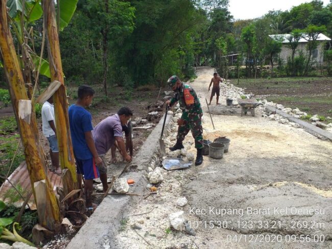 Ia hadir membantu warga melaksanakan kegiatan karya bakti pembangunan jalan bertempat di RT. 009 RW. 005 Kelurahan Oenesu Kecamatan Kupang Barat Kabupaten Kupang, Jum’at (4/12).