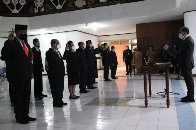 KUPANG, FLOBAMORA-SPOT.COM – Wali Kota Kupang, Dr. Jefirstson R. Riwu Kore, MM, MH mengambil sumpah dan melantik 11 orang yaitu pejabat pimpinan tinggi pratama dan pejabat fungsional pengelola barang dan jasa pemerintah di lingkungan Pemerintah Kota Kupang. Pelantikan berlangsung di lantai 1 Kantor Walikota Kupang, Senin (21/12) siang.