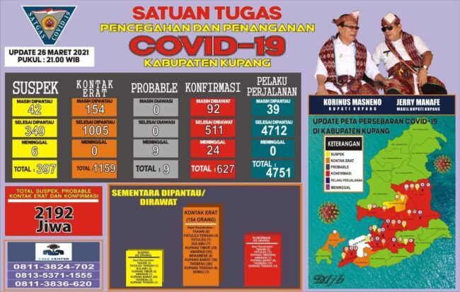 KUPANG, FLOBAMORA-SPOT.COM – Satuan Tugas Penanganan Covid-19 di Kabupaten kembali merilis data kasus baru Covid-19 di kabupaten Kupang. Jumlah Kasus mencapai 627 pada Jumat (26/3/21).