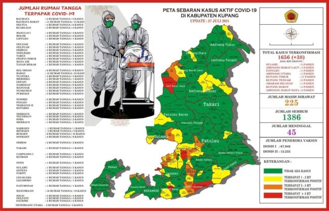 Lantas berapa total positif Covid-19 sampai Selasa (27/7/21) Sekda Kabupaten Kupang mengatakan, “Total positif covid-19 hingga saat ini 1656 orang, total sembuh 1386 orang, meninggal sudah 45 orang”.