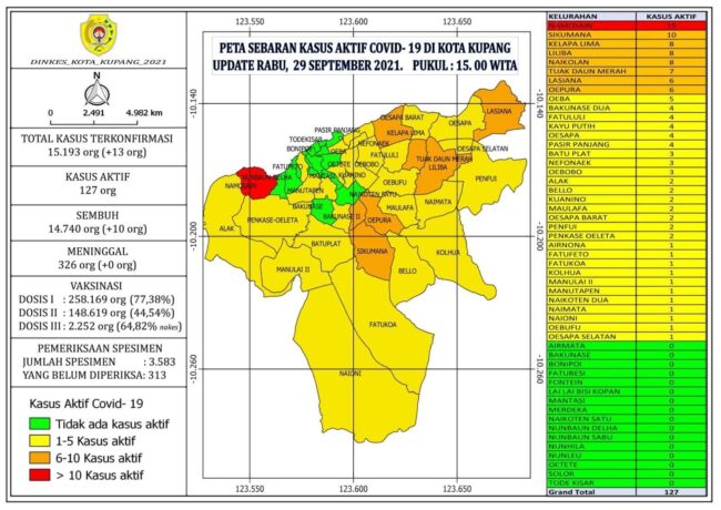 “Disampaikan kepada Masyarakat Kota Kupang, bahwa total Kasus sebanyak 15.193 Orang. Naik sebanyak 13 Orang”, lapor Juru Bicara Covid-19 Kota Kupang Ernest Ludji, S.STP, M.Si kepada Media Rabu malam (29/9/21).
