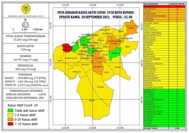 KUPANG, FLOBAMORA-SPOT.COM – Juru bicara Gugus Tugas Covid-19 Kota Kupang Ernest Ludji, S.STP, M.Si kembali mengapdet data monitor Kamis, (30/9/ 2021).
