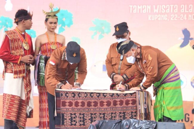 KUPANG, FLOBAMORA-SPOT.COM – Dalam acara puncak peringatan Hari Konservasi Alam (2021) yang diselenggarakan oleh Kementerian Lingkungan Hidup dan Kehutanan (KLHK) di Pantai Lasiana Kota Kupang pada Rabu (24/11) dilaksanakan penandatanganan Nota Kesepahaman oleh Dirjen Konservasi Sumber Daya Alam dan Ekosistem (KSDAE) KLHK dengan Pemerintah Provinsi NTT. Kerja Sama tersebut mengenai Penguatan Fungsi Kawasana Konservasj Dan Konservasi Sumber Daya Alam Hayati Dan Ekosistemnya Secara Berkelanjutan Di Taman Nasional Komodo