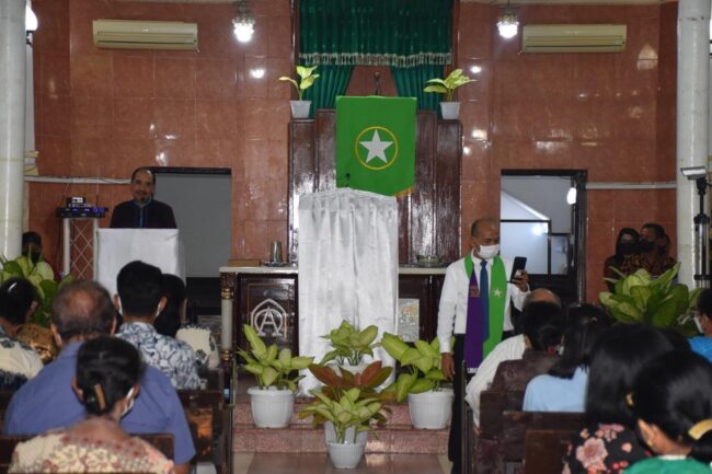 Walikota Kupang Dr. jefri sedang menyampaikan sambutan pada ibadah pembukaan pelayanan Jemaat Kota Kupang Tahun 2022 sekaligus pencanangan penataan halaman gedung kebaktian dan renovasi gedung Rabu (2/2/22).