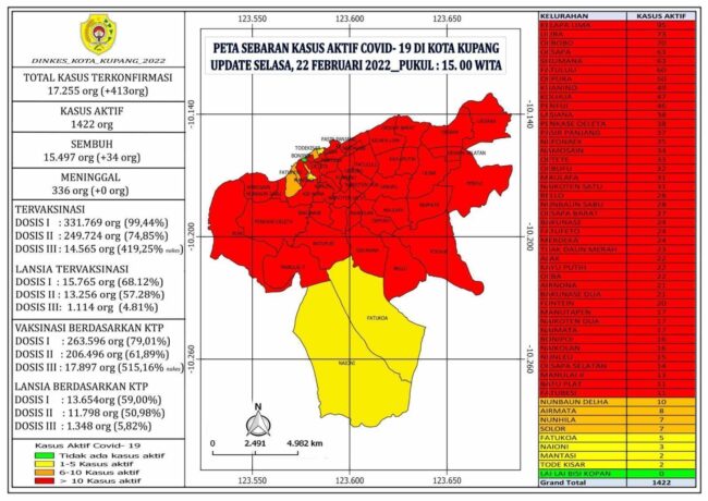 “Total Kasus sebanyak 17.255 Orang. Naik sebanyak 413 Orang”, jelas sekretaris Satgas Covid-19 Kota Kupang Ernest Ludji, dalam rilis kepada berbagai Media Selasa (22/2/22).