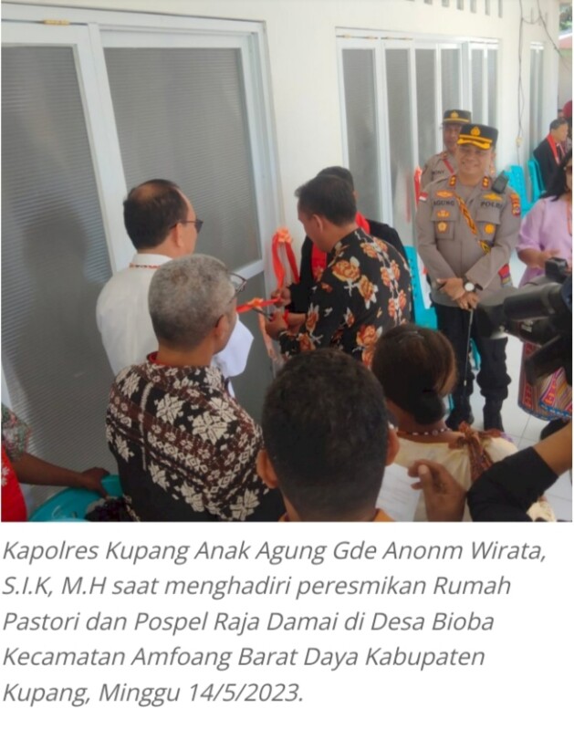 OELAMASI, FLOBAMORA-SPOT – Kepala Kepolisian Resor Kupang AKBP Anak AGung Gde Anom Wirata, S.I.K, M.H rela jauh-jauh datang ke Desa Bioba Kecamatan Amfoang Barat Daya Kabupaten Kupang, untuk menghadiri Peresmian Rumah Pastori dan Pos Pelayanan Raja Damai Bioba, Minggu (14/5/2023) pagi.