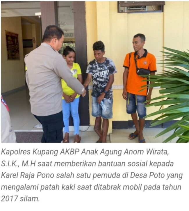 Nampak hari ini Rabu (20/9) pagi, bertempat dilobi Mako Polres Kupang, AKBP Agung menyerahkan bantuan sembako dan uang santunan kepada Karel Raja Pono, warga RT 01 RW 01 Desa Poto Kecamatan Fatuleu Barat Kabupaten Kupang, Provinsi Nusa Tenggara Timur yang cacat permanen (patah kaki) akibat kecelakaan lalu lintas (ditabrak mobil) saat berusia masih 16 tahun di Desa Kalai tahun 2017 silam.