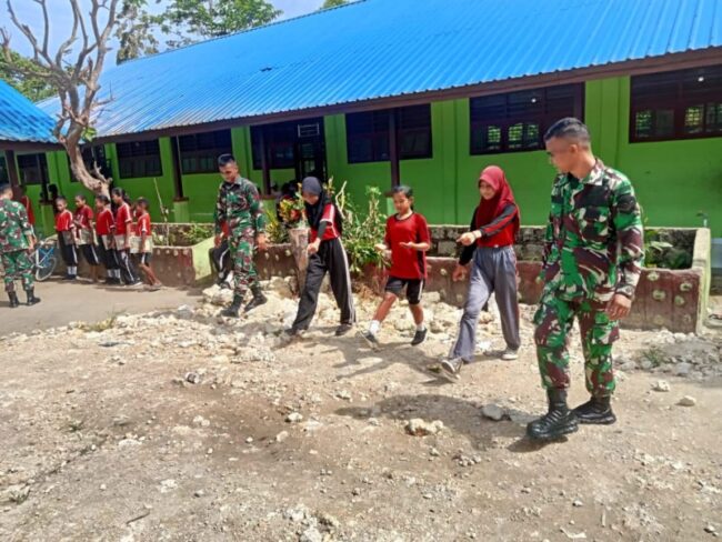 Anggota TNI melatih dan memberikan wawasan kepada anak-anak di perbatasan.