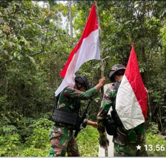 KEEROM, FLOBAMORA-SPOT – Untuk memastikan patok batas negara RI dengan Papua Nugini (PNG) Satuan Tugas Pengamanan Perbatasan (satgas pamtas) melaksanakan Patroli MM 4.1, di wilayah Kalipay, Distrik Waris, Kabupaten Keerom, Kamis (23/5/24).