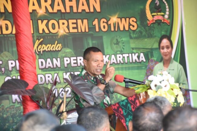 SOE, FLOBAMORA-SPOT – Danrem 161/Wira Sakti Brigjen TNI Joao Xavier Barreto Nunes, S.E., M.M di dampingi Ketua Persit KCK Koorcab Rem 161/Wira Sakti Paula Nunes