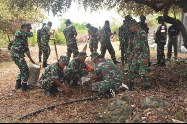 OELAMASI, FLOBAMORA-SPOT – Danrem 161/Wira Sakti, Brigjen TNI Joao Xavier Barreto Nunes, S.E., M.M., pimpin langsung kegiatan karya bakti pembersihan di seputaran taman doa Yesus Maria dan penanaman pohon.