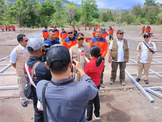 LARANTUKA, FLOBAMORA-SPOT – Kepala Badan Nasional Penanggulangan Bencana (BNPB), Letjen TNI Dr. Suharyanto, S.Sos., M.M., beserta rombongan melakukan kunjungan kerja ke Satuan Tugas (Satgas) Hunian Sementara (Huntara) korban erupsi Gunung Lewotobi Laki-Laki, pada Selasa (3/12/2024).