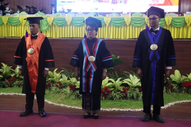 KUPANG, FLOBAMORA-SPOT — Penjabat Gubernur NTT, Dr. Andriko Noto Susanto, S.P., M.P. menghadiri Rapat Senat Terbuka Luar Biasa Pengukuhan Guru Besar Universitas Nusa Cendana di Auditorium Undana, Selasa (7/1/2025). Andriko Susanto dalam sambutannya menyampaikan selamat kepada ketiga Guru Besar yang telah dikukuhkan.