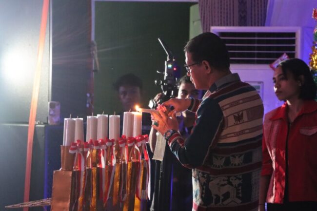 Pj. Gubernur NTT Andriko Noto Susanto menyalakan lilin pertama pada acara Natal bersama di Korem 161/ws.