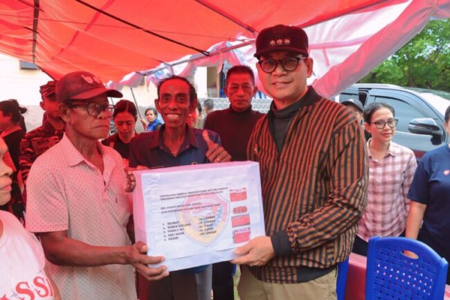 Pj. Gubernur Andriko Noto Susanto menyerahkan bantuan kepada, korban banjir rob di pesisir Tablolong.