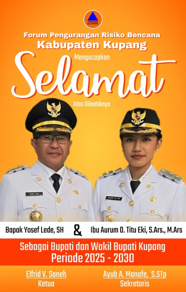 “Saya mengucapkan proficiat bagi Pak Yosef Lede dan Aurum Titu Eki yang Mendapatkan amanat dari masyarakat Kabupaten Kupang dan Sudah dikukuhkan Oleh Presiden Republik Indonesia”, ucap Ketua Forum Pengurangan Risiko Bencana (FPRB) Kabupaten Kupang Eldridge Saneh lewat pesan WhatsApp kepada media ini Jumat (21/2/25).