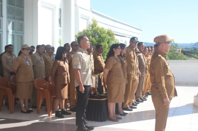 OELAMASI, FLOBAMORA-SPOT — Bupati Kupang Yosef Lede memimpin Apel Perdana, Senin (3/3/2025) bertempat di Halaman Kantor Bupati Kupang di Oelamasi.