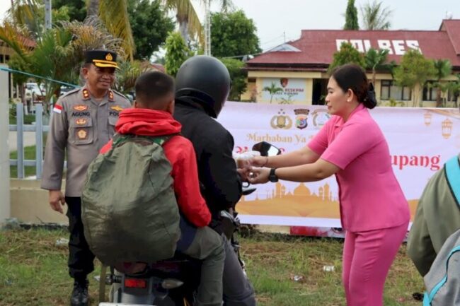 Selain membagikan takjil, Bhayangkari Cabang Kupang juga menyampaikan pesan-pesan humanis untuk menjaga ketertiban selama bulan Ramadhan.