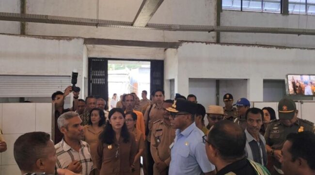 OELAMASI, FLOBAMORA-SPOT — Dua Pejabat politik masing-masing Wakil Bupati Kupang, Aurum Titu Eki, dan Wakil Gubernur NTT, Johanis Asadoma, melakukan kunjungan kerja ke Pasar Lili, di Kelurahan Camplong, Kecamatan Fatuleu, Selasa (18/3/25).
