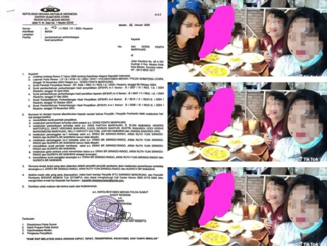 MEDAN, FLOBAMORA-SPOT –— “Penyidik Polrestabes Medan telah menetapkan tersangka kepada Arini Ruth Yuni br Siringoringo, Erika br Siringoringo dan Nurinta br Nababan pada 6 Januari 2025 lalu. Disertai dengan surat penjemputan terhadap ketiga tersangka di bulan Februari. Tetapi sampai berita ini diterbitkan ketiga tersangka belum juga berhasil diamankan oleh Polrestabes Medan. Doris Fenita br Marpaung merasa dirinya dizolimi pihak kepolisian”.