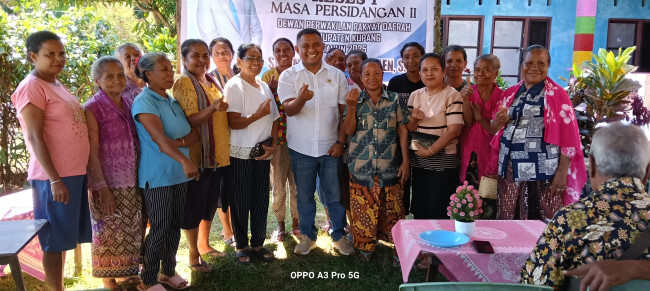 Anika Debora Ruku mengeluhkan persoalan air bersih kepada anggota DPRD Kabupaten Kupang Salomiel Arnius Buraen alias Ary Buraen saat reses di Dusun 8 desa Tunbaun, Senin (28/4/25).