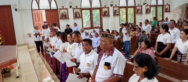 KUPANG, FLOBAMORA-SPOT — Pastor Paroki Santo Fransikus dari Assisi Kolhua Keuskupan Agung Kupang RD Longginus Dua Bone, mengambil sumpah dan melantik lima pengurus dan anggota cabang Sahabat Monsinyur Gabiel Manek (SMGM) se- wilayah Paroki itu.