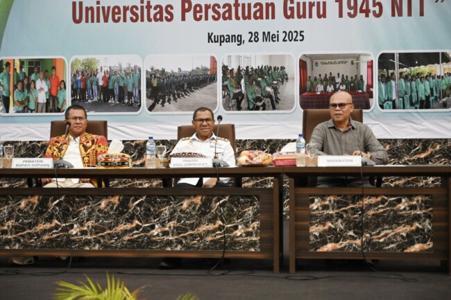 KUPANG, FLOBAMORA-SPOT — Bupati Kupang Yosef Lede menjadi narasumber pada kegiatan pembekalan Kuliah Kerja Nyata (KKN) Mahasiswa Universitas Persatuan Guru (UPG 1945), Rabu, (28/5/2025) bertempat di Aula El Tari Kupang.