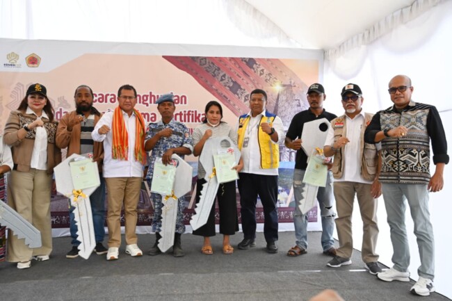 Sebanyak 324 kepala keluarga menerima kunci rumah dan sertifikat yang secara simbolis diberikan langsung Bupati Kupang Yosef Lede.