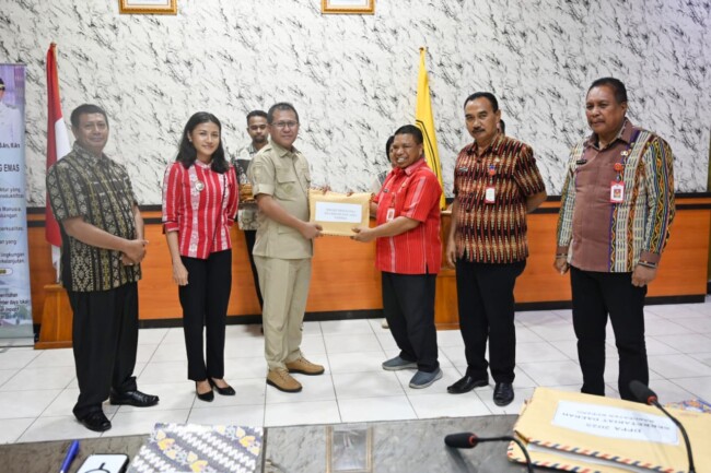 Bupati Kupang Yosef Lede menyerahkan DPPA kepada Kepala BPKAD Okto Tahik disaksikan Wakil Bupati Kupang Aurum Titu Eki dan para Asisten Sekda.