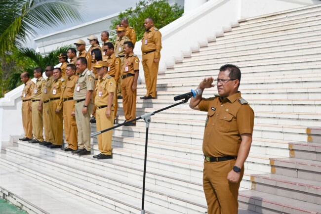 OELAMASI, FLOBAMORA-SPOT — Bupati Kupang, Yosef Lede bertindak sebagai pembina pada apel kekuatan Lingkup Pemkab Kupang, bertempat di Lapangan Upacara Kantor Bupati Selasa (4/11/25).