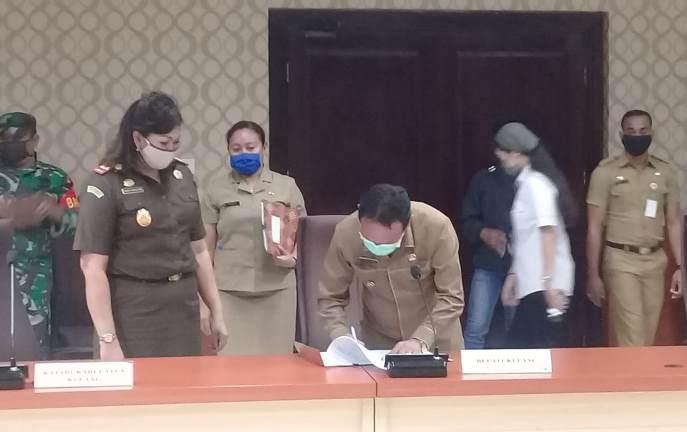 KUPANG, FLOBAMORA-SPOT.COM – Bupati Kupang, Korinus Masneno menyambut positif momentum penandatanganan nota kesepahaman bersama antara Pemkab Kupang dan Kejari Kupang tentang pendampingan dan pengawasan akuntabiitas penanggulangan dan pencegahan Coronavirus Disease 2019 atau Covid-19. Penandatanganan nota kesepahaman antara Korinus Masneno sebagai Bupati Kupang dan Sherly Manutede sebagai Kepala Kejaksaan Negeri Kupang ini berlangsung, Senin 11 Mei 2020 di ruang rapat Gubernur NTT.