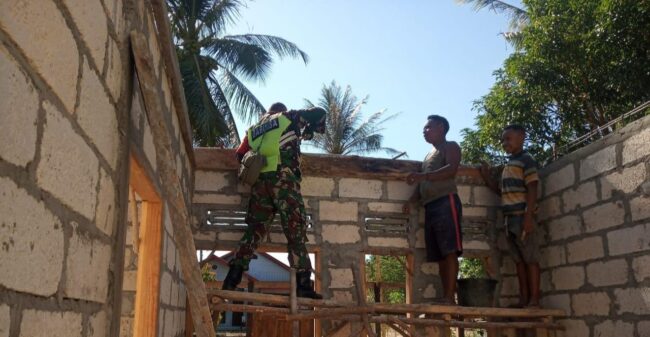 OELAMASI, FLOBAMORA-SPOT.COM – Sertu Guliat Sae Babinsa Koramil 1604-04/Amarasi yang berada bawah Kodim 1604/Kupang melaksanakan kerja bakti membantu warga membangun rumah tinggal milik Ely Bani di Dusun 04 Noenak Desa Rabeka Kecamatan Amarasi Timur Kabupaten Kupang, Rabu (30/9/20).
